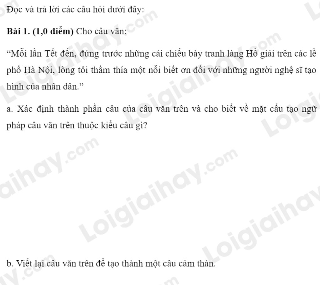 Đáp án (ví dụ): Ôi chao, mỗi lần Tết đến, đứng trước những cái chiếu bày tranh làng Hồ giải trên các lề phố Hà Nội, lòng tôi thấm thía một nỗi biết ơn đối với những người nghệ sĩ tạo hình của nhân dân
