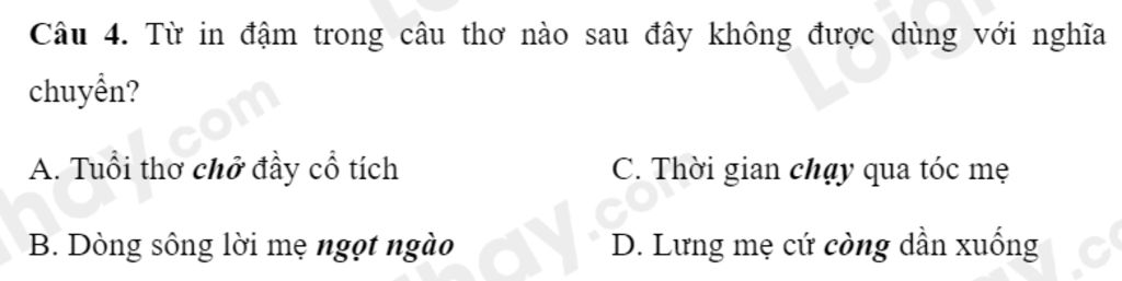 Câu `4` Từ in đậm trong câu thơ nào sau đây không được dùng với ngĩa chuyển ?
