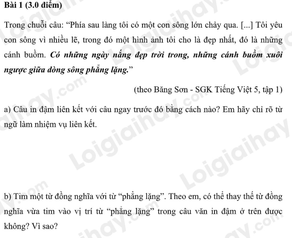 Trong chuỗi câu: “Phía sau làng tôi có một con sông lớn chảy qua. [...] Tôi yêu con sông vì nhiều lẽ, trong đó một hình ảnh tôi cho là đẹp nhất, đó là những cánh buồm. Có những ngày nắng đẹp trời trong, những cánh buồm xuôi ngược giữa dòng sông phẳng lặng.”