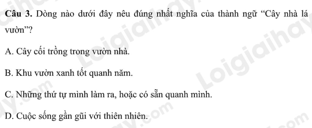Câu 3. Dòng nào dưới đây nêu đúng nhất nghĩa của thành ngữ “Cây nhà lá vườn”?