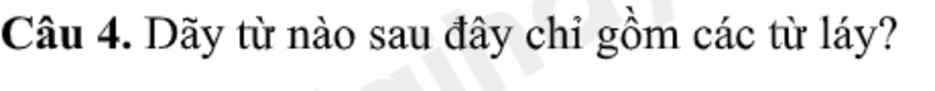 Câu `4.` Dãy từ nào sau đây chỉ gồm các từ láy?