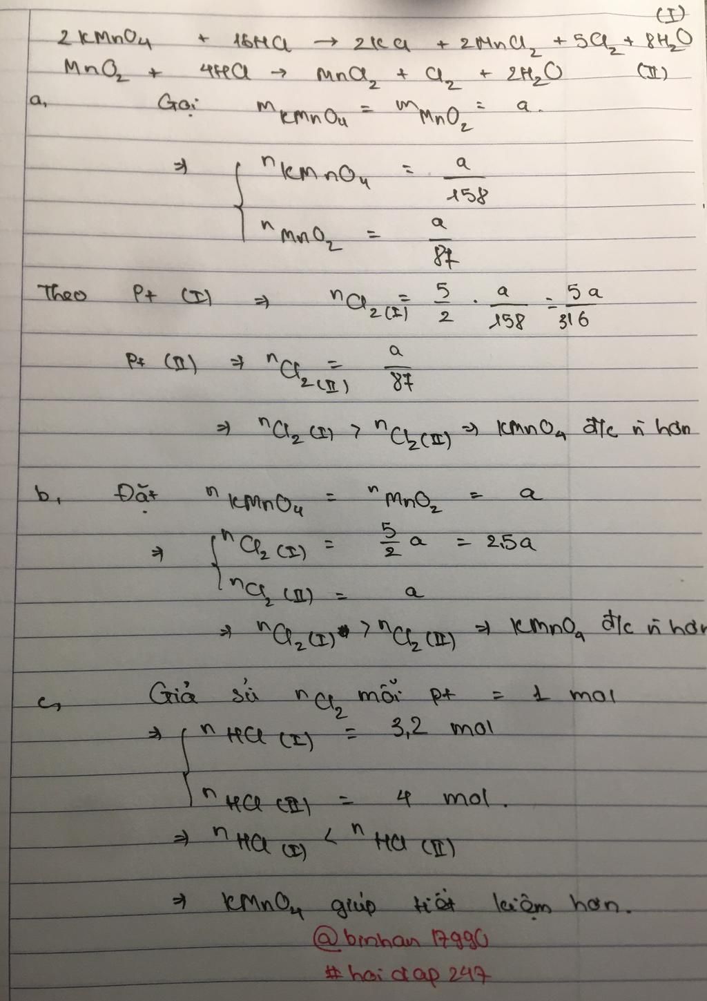 `a.` `KMnO_4` điều chế ra được `Cl_2` hơn