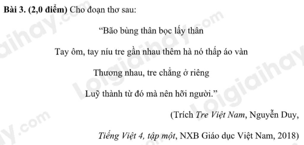 `-` Biện pháp tu từ : nhân hóa. Cụ thể, cây tre được nhân hóa với hành động "bọc lấy thân", "tay ôm", "tay níu" như thể chúng có cảm xúc và khả năng hành động như con người.
