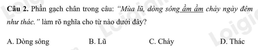 Câu 2. Phần gạch chân trong câu: “Mùa lũ, dòng sông ầm ầm chảy ngày đêm như thác.” làm rõ nghĩa cho từ nào dưới đây?