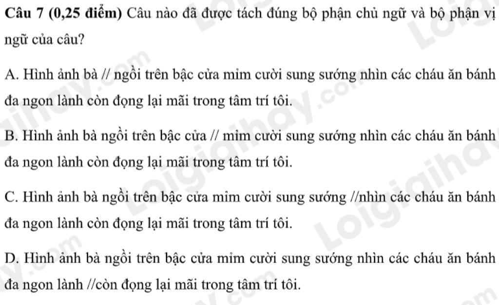 `@` Câu "Hình ảnh bà ngồi trên bậc cửa mỉm cười sung sướng nhìn các cháu ăn bánh đa ngon lành còn đọng lại mãi trong tâm trí tôi."