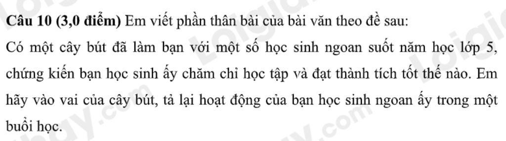 Có một cây bút đã làm bạn với một số học sinh ngoan suốt năm học lớp 5, chứng kiến bạn học sinh ấy chăm chỉ học tập và đạt thành tích tốt thế nào. Em hãy vào vai của cây bút, tả lại hoạt động của bạn học sinh ngoan ấy trong một buổi học.