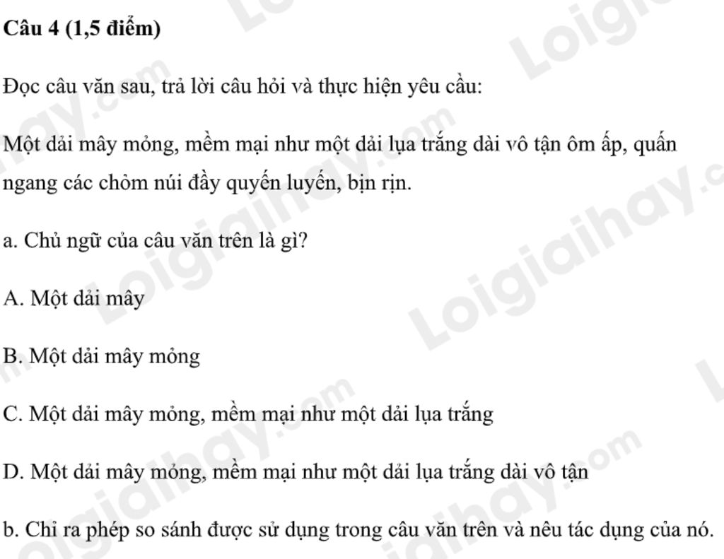 Câu ` 4 `: ` a `, ` A `. Một dải mây.
