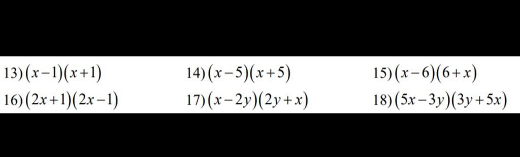`18) (5x - 3y)(3y+5x) = (5x-3y)(5x+3y) = 25x^2 - 9y^2`