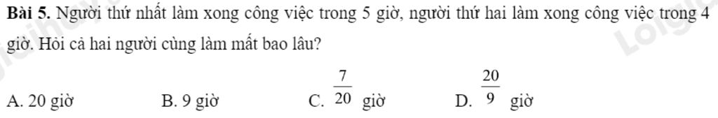 Vậy cả hai người cùng làm công việc đó thì mất `20/9` giờ.