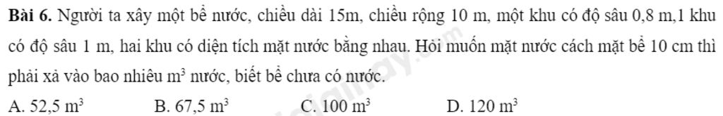 Để mặt nước các mặt bể `10cm` thì phải xả số `m^{3}` nước là: