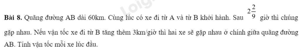 Biết vận tốc xe đi từ B tăng thêm 3km/giờ thì hai xe sẽ gặp nhau ở chính giữa quãng đường AB, suy ra v1 – v2 = 3