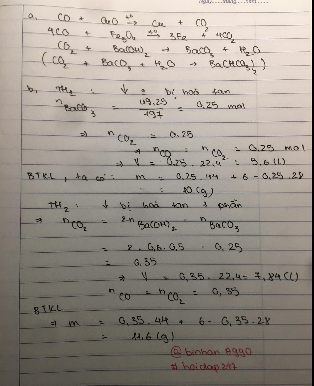 Theo PT: `n_{CO}=n_{CO_2}=n_{BaCO_3}=0,25(mol)`