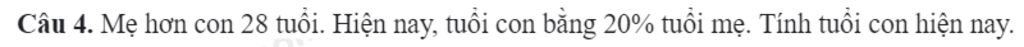 Tuổi con bằng 20% tuổi mẹ $ \Rightarrow $ tuổi con bằng $\frac{1}{5}$ tuổi mẹ