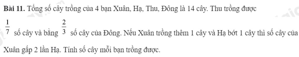 Tổng số cây của Xuân và Hạ trồng được là: 14 – (2 + 3) = 9 (cây)