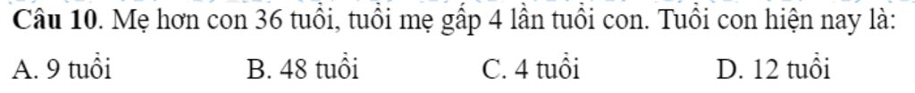 Tuổi con hiện nay là 36 : (4 – 1) = 12 (tuổi)