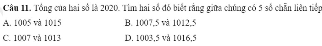 Ta có giữa 2 số có 5 số chẵn liên tiếp nên hiệu hai số là 10 hoặc 12