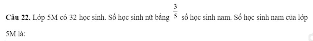 Số học sinh nam của lớp 5M là $32 \times \frac{5}{8} = 20$ (học sinh)