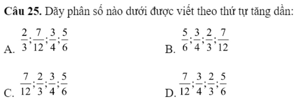 Vậy thứ tự tăng dần là $\frac{7}{{12}};\frac{2}{3};\frac{3}{4};\frac{5}{6}$
