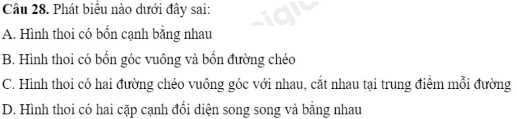 Phát biểu sai là: Hình thoi có bốn góc vuông và bốn đường chéo