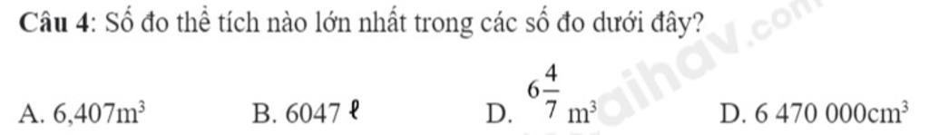 Đổi 6047$\ell $ = 6047 dm3 = 6,047m3
