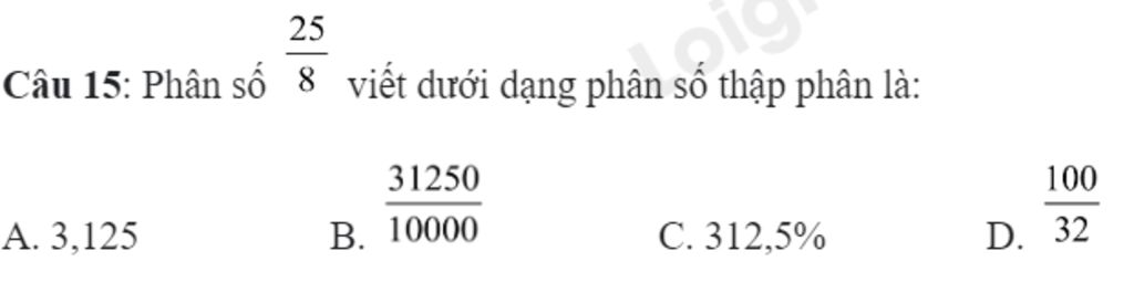 Ta có $\frac{{25}}{8} = \frac{{25 \times 1250}}{{8 \times 1250}} = \frac{{31250}}{{10000}}$