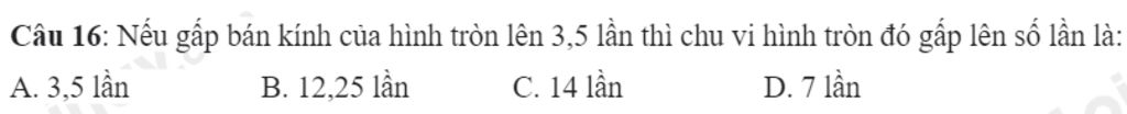 Nếu gấp bán kính của hình tròn lên `3,5` lần thì chu vi của hình tròn đó là: