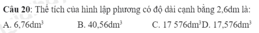 Thể tích của hình lập phương là 2,6 x 2,6 x 2,6 = 17 576 (dm3)
