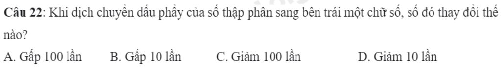 Khi dịch chuyển dấu phẩy của số thập phân sang bên trái một chữ số thì số đó giảm đi 10 lần.