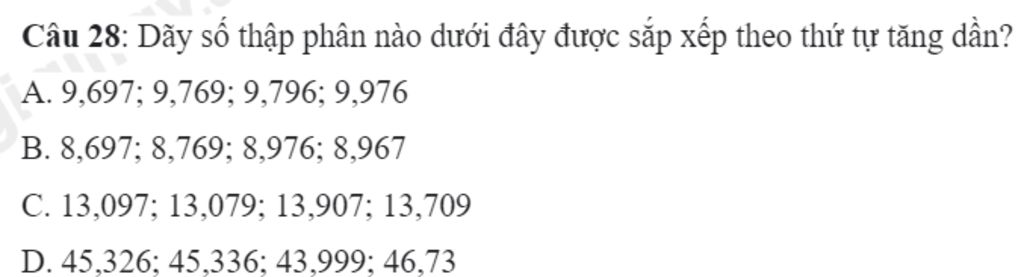 `A.` Các số sắp xếp theo thứ tự tăng dần