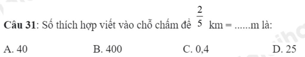 `->2/5km=2/5. 1000=\frac{2000}{5}=400m`