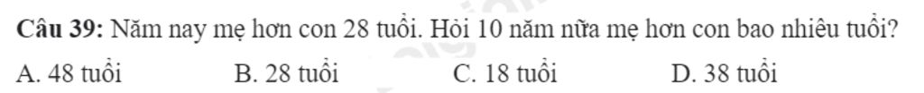 Vì hiệu số tuổi của hai mẹ con không thay đổi theo thời gian nên 10 năm nữa mẹ vẫn hơn con 28 tuổi.