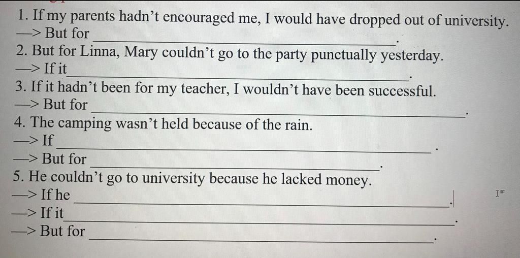 - But for : Nếu không có, thường được dùng trong câu điều kiện loại 2 và 3 `->` But for + danh từ/ cụm danh từ/ V-ing