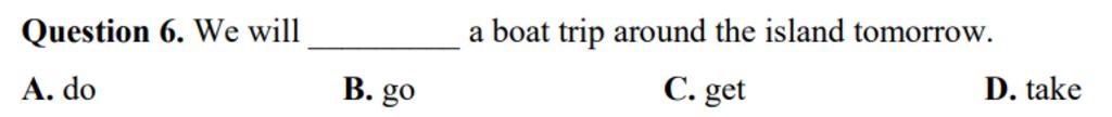 `-` take a boat trip (cụm N): có 1 chuyến đi thuyền