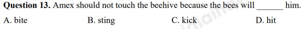 -> Con ong sẽ không thể cắn, đá, đánh vì chúng có kích thước rất nhỏ không thể tổn hại đến con người nhưng ong có thể sẽ đốt nếu ai đó chạm hoặc chọc tổ ong -> Loại A, C, D -> B đúng