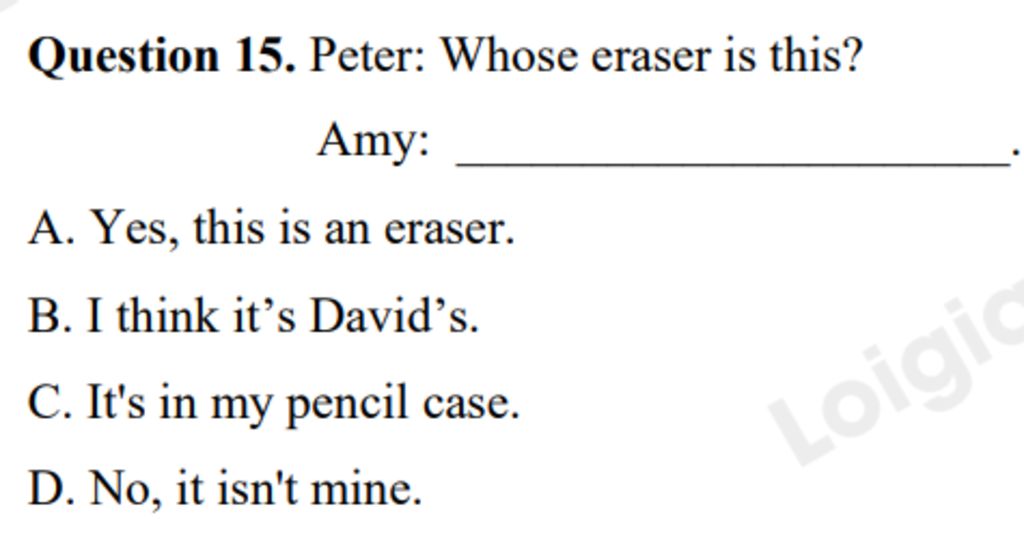 `+` D : Không, nó không phải của tôi `->` Trả lời là Yes/No là chỉ câu hỏi đảo Trợ động từ. Loại