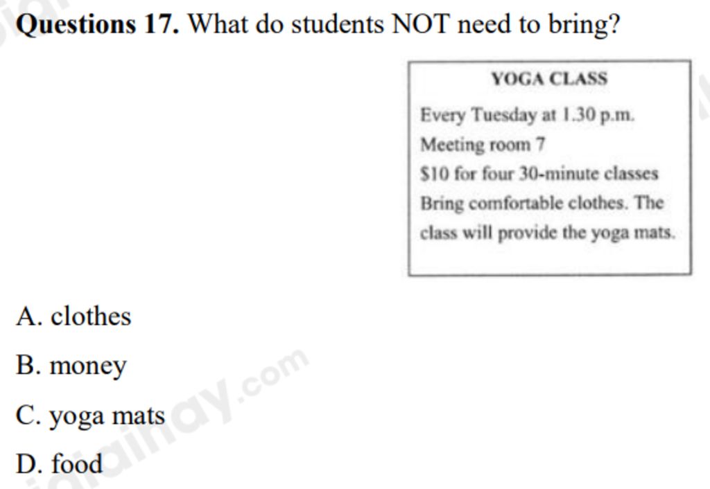 Giải thích: Trên bài viết có viết "The class will provide the yoga mats" tạm dịch là "Lớp sẽ cung cấp thảm yoga" `=>` Students not need to bring yoga mats `=>` C đúng