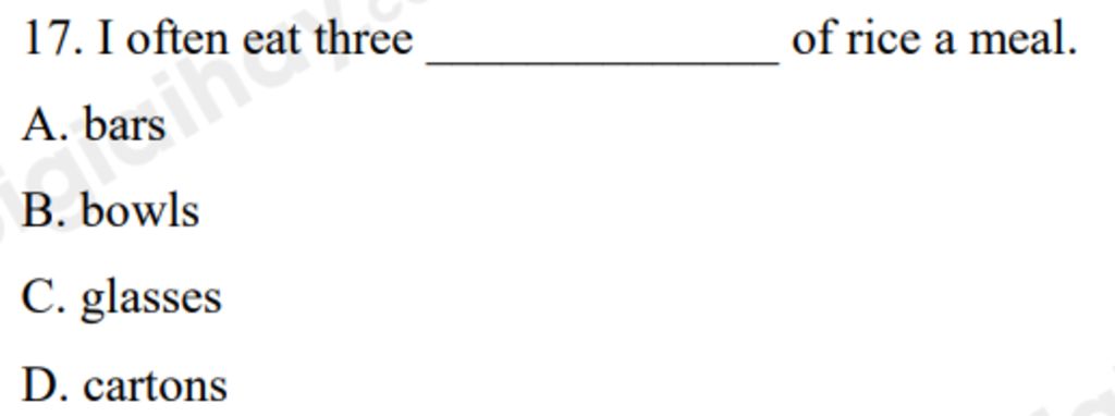 `-` Tôi thường ăn ba _____ cơm một bữa