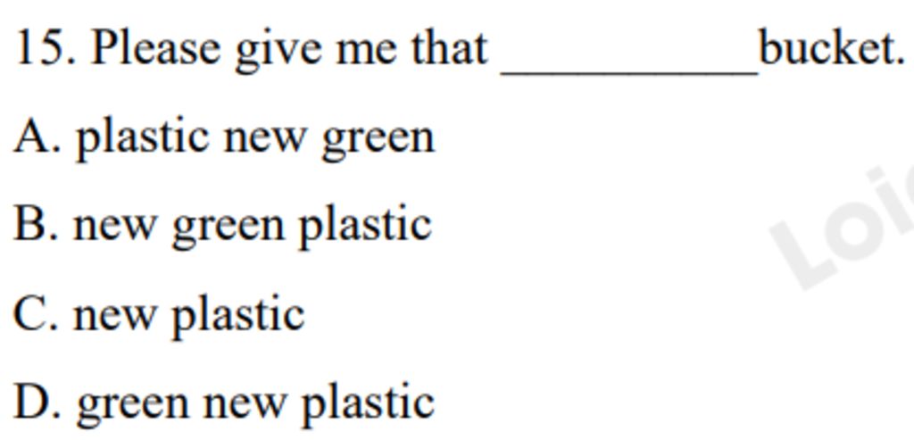 `->` Trật tự tính từ `:` Ý kiến `->` Kích cỡ `->` Tuổi `->` Hình dạng `->` Màu sắc `->` Xuất xứ `->` Chất liệu `->` Mục đích