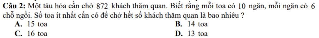 Suy ra số toa ít nhất cần có để chở hết số khách tham quan là: