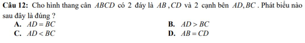 Vì $ABCD$ là hình thang cân đáy $AB, CD$ và cạnh bên $AD, BC$