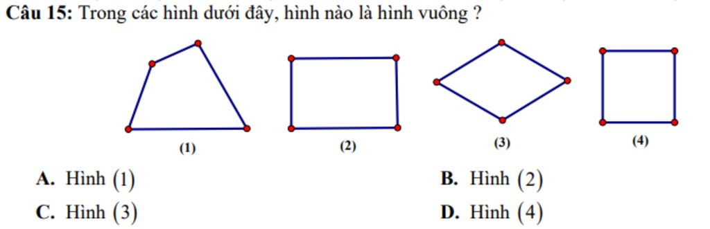 `->` Hình có `4` cạnh bằng nhau là: Hình `(4)`