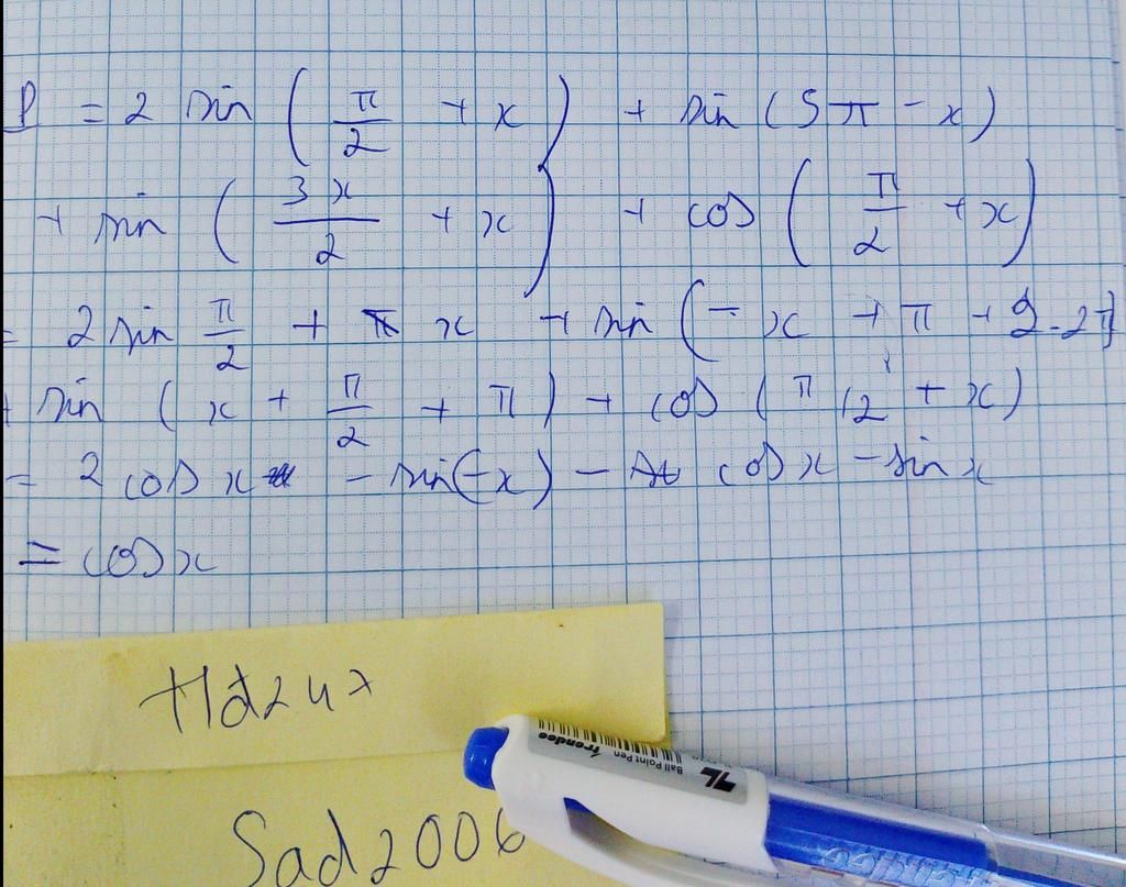 `P=2sin((\pi)/(2)+x)+sin(5\pi -x)+sin((3\pi)/(2)+x)+cos((\pi)/(2)+x)`