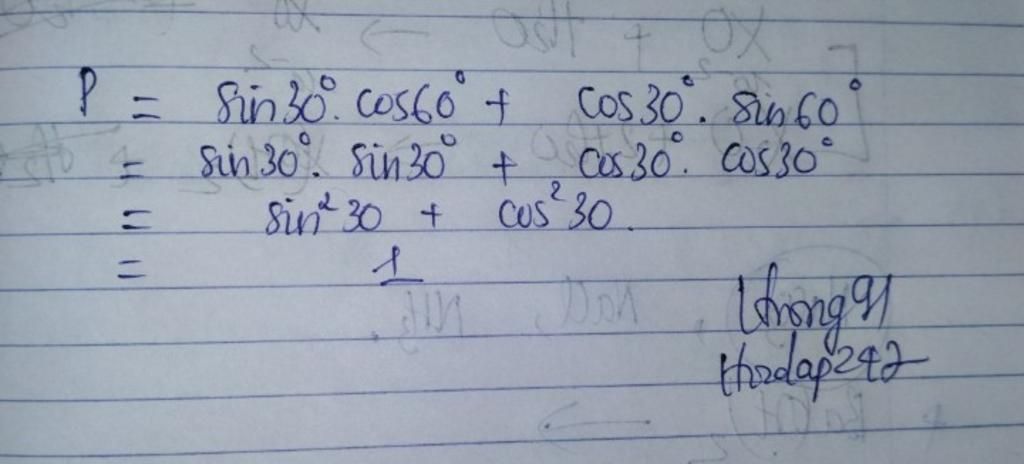 $\sin 30^o . \cos 60^o + \cos 30^o . \sin 60^o$