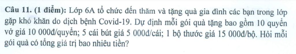 Mỗi gói quà bao gồm `10` quyển vở, `5` cái bút và `1` bộ thước hết số tiền là :