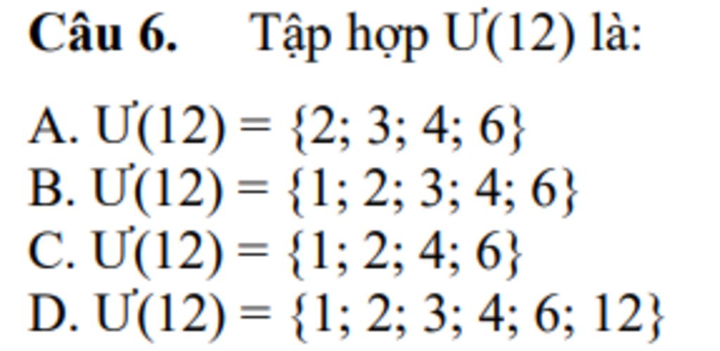 `=>` Chọn `D.Ư(12)={1;2;3;4;6;12}`