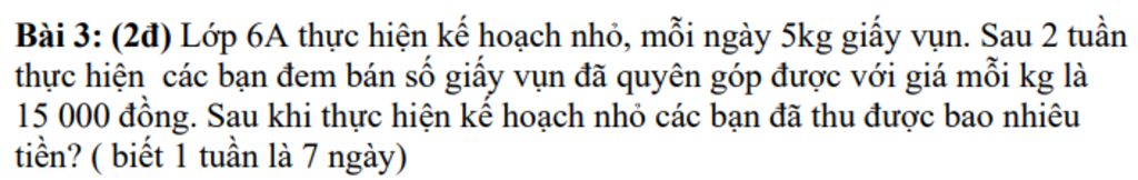 Sau `2` tuần thực hiện kế hoạch nhỏ, số giấy các bạn lớp `6A` quyên góp được là :