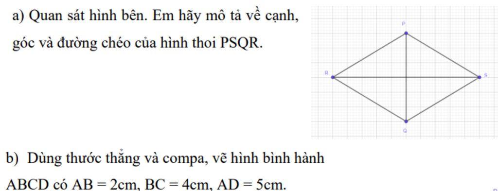 - Hai đường chéo $PQ, RS$ vuông góc với nhau