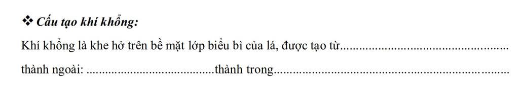 Khí khổng là khe hở trên bề mặt lớp biểu bì của lá, được tạo từ hai tế bào bảo vệ có hình bầu dục như hạt đậu quay vào nhau, để một khe hở nhỏ liên thông giữa khoảng gian bào lá với không khí gọi là vi khẩu. thành ngoài: là thành mỏng thành trong là thành dày.