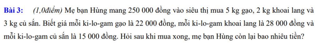 - Số tiền mua 3kg củ sắn: `15 000 . 3 = 45 000` (đồng)