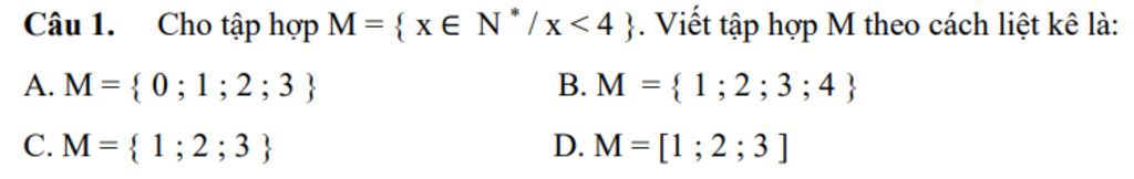 Câu 1. Cho tập hợp M = {x ∈ N* / x < 4}. Viết tập hợp M theo cách liệt kê là: